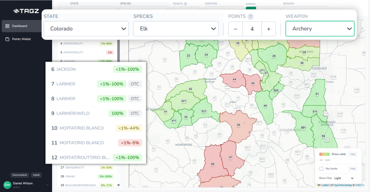 Access up-to-date season dates, odds projected for 2026, and tag fees all in one place. Compare odds for both residents and nonresidents, see all seasons covered by the same tag, and check available OTC options.